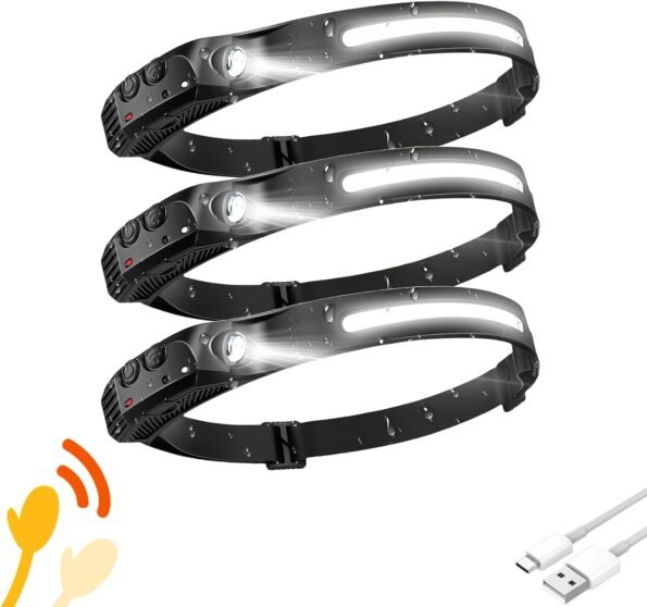 Headlamp 3 PCS, 230° Wide Beam Head Lamp, Motion Sensor Headlamp Rechargeable, 5 Mode Headlight Flashlight for Camping Fishing Hiking Gear, Bright, and Ideal for Hard Hats and Forehead Use!
