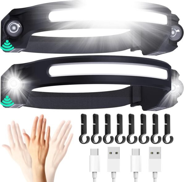 - 【6 Light Modes & Motion Sensing】 Head lamps have 6 working modes, including COB high mode, COB low mode, XPE high mode, XPE low mode, strobe mode and motion sensor mode to meet all scenarios, 3-second press of the power button to transform the strobe mode. The first 5 modes of headlights can be used in conjunction with motion sensors mode. Press the motion sensor button, then you can turn the head flashlight on or off with a wave of your hand.