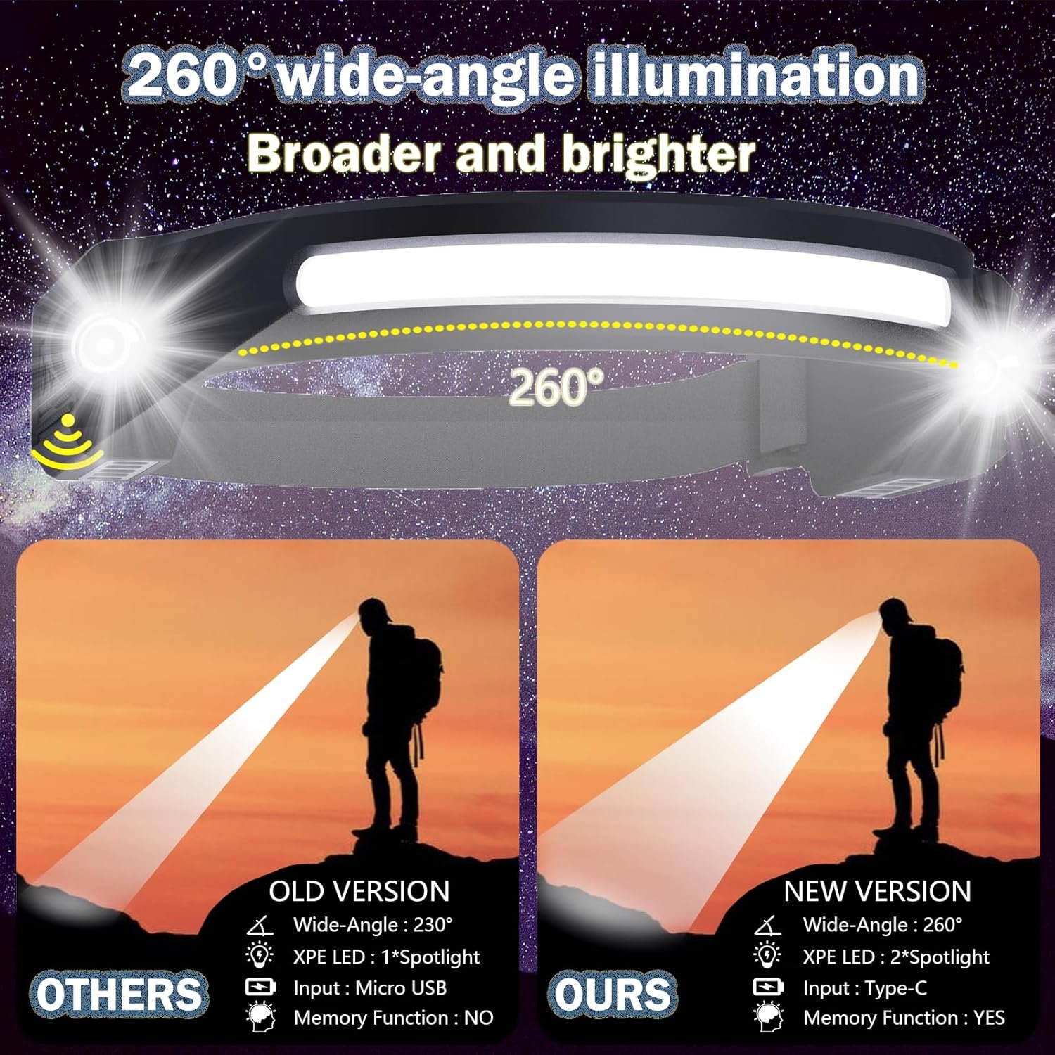 - 【260° Wide Beam & 300 feet-Distance】 headlamp with 2*COB strip floodlight can provide 260° wide angle lighting, which allows you to illuminate the viewing area without moving your head. Unlike traditional headlights, it has a better view, and you can also use its spotlight to focus on specific areas.Equipped with super bright XPE light on the side, headlamp rechargeable can be used as a spotlight to illuminate a distance of nearly 300 feet.