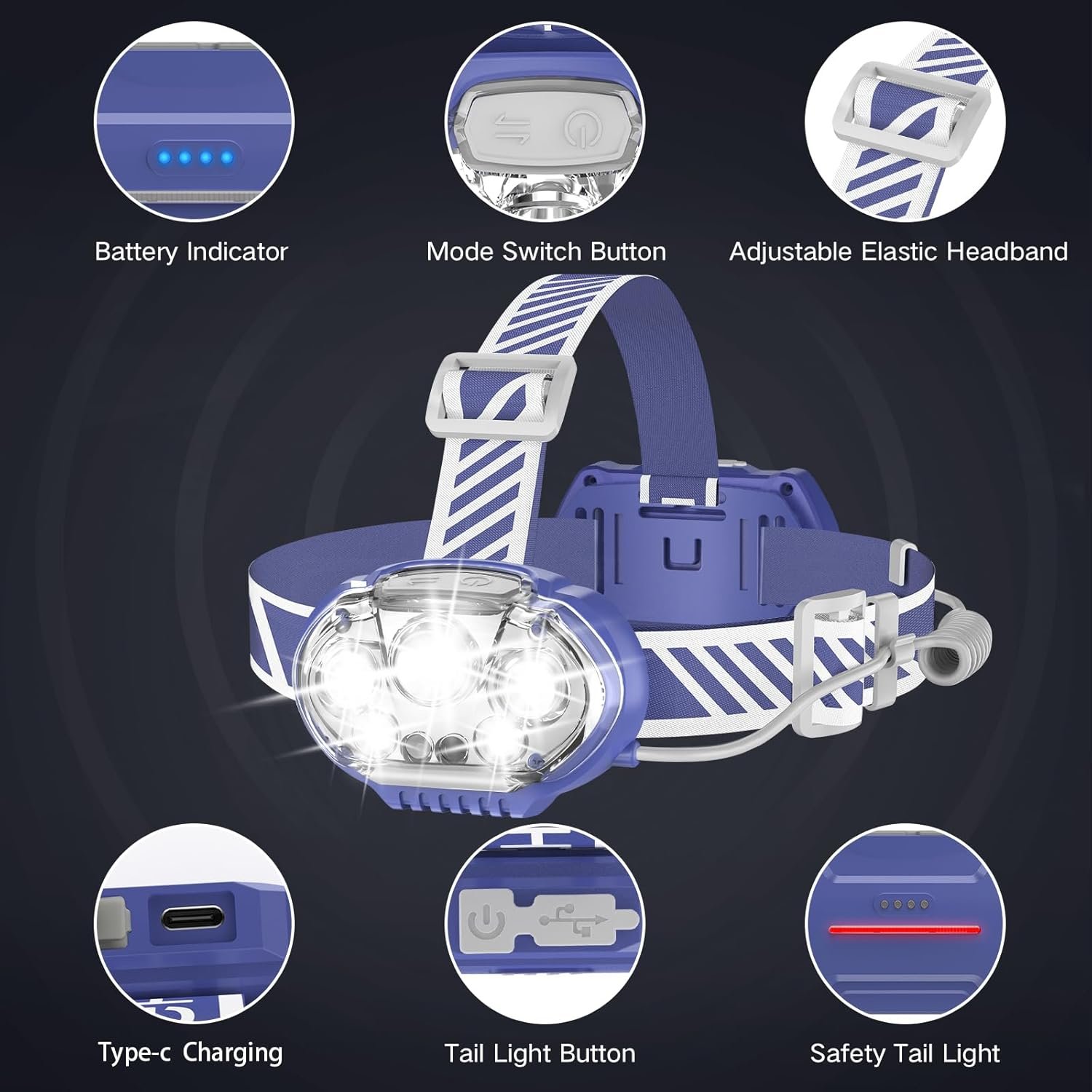 Rechargeable Headlamp, 20000 High Lumen Bright 5 Headlamp with Red and White Light, Waterproof Headlamp, 8 Modes Head Flashlight for Running Hunting Fishing Hiking Camping Equipment – Blue