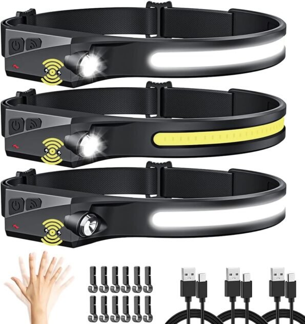 Rechargeable Headlamp 3 Pack, Headlamp Flashlight with Motion Sensor, 230° Wide Beam Headlamp, 5 Modes Forehead Waterproof Headlamp for Adults Running Camping