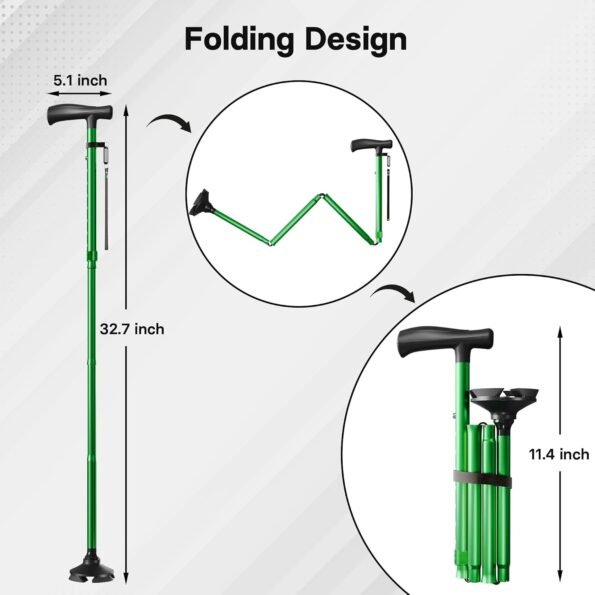 - Compact & Foldable Design: With no assembly required, the quick locking mechanism allows the cane to snap back out to its full extension height after unfolding. Crafted from lightweight and durable aluminium, its four-fold design allows the cane to be easily fitted into a backpack, briefcase, carry-on luggage or wheelchair bag, which makes carrying and storing no longer a hassle. The cane comes with a high-quality hook and loop fastener strap for convenient closure.